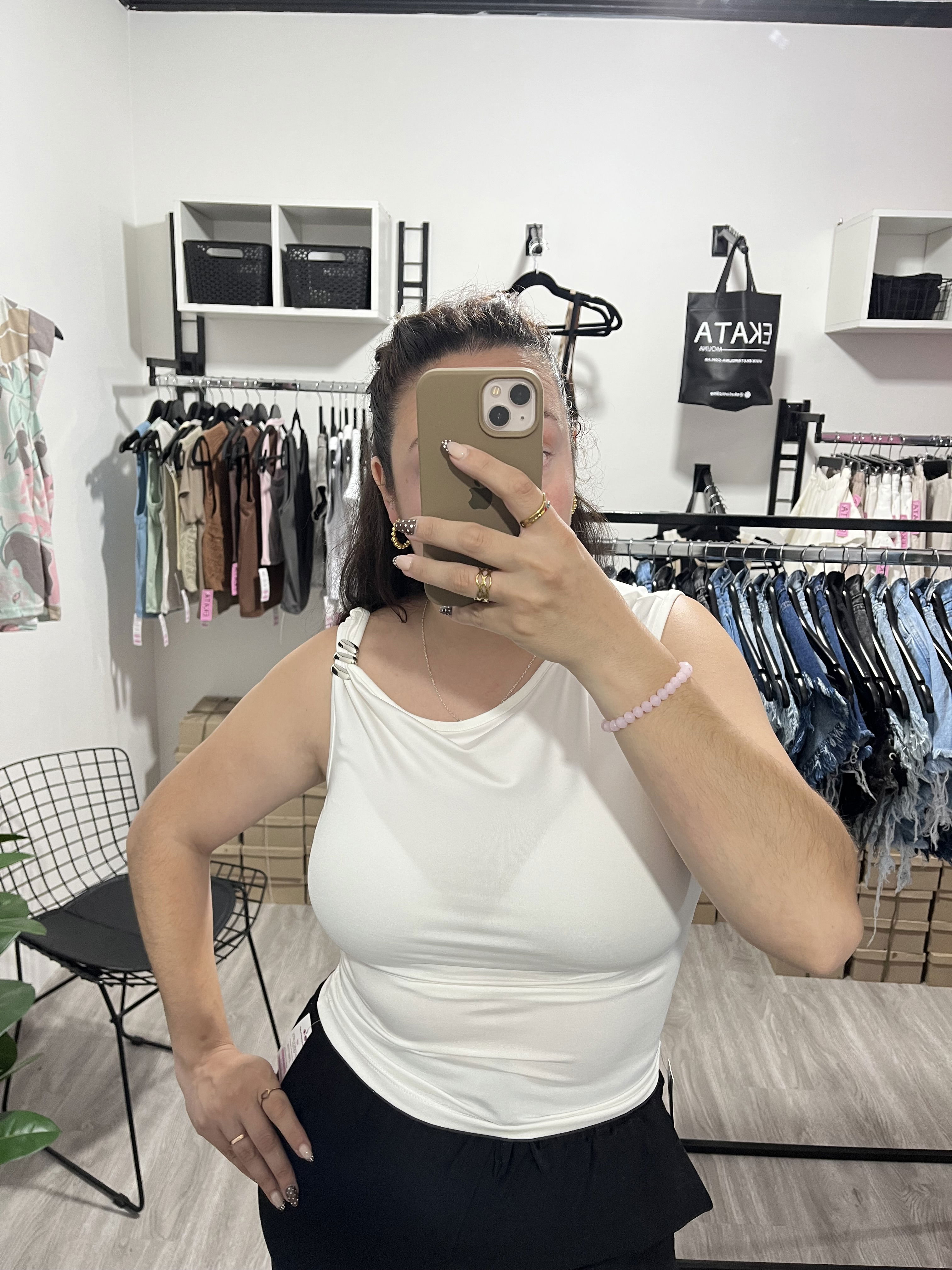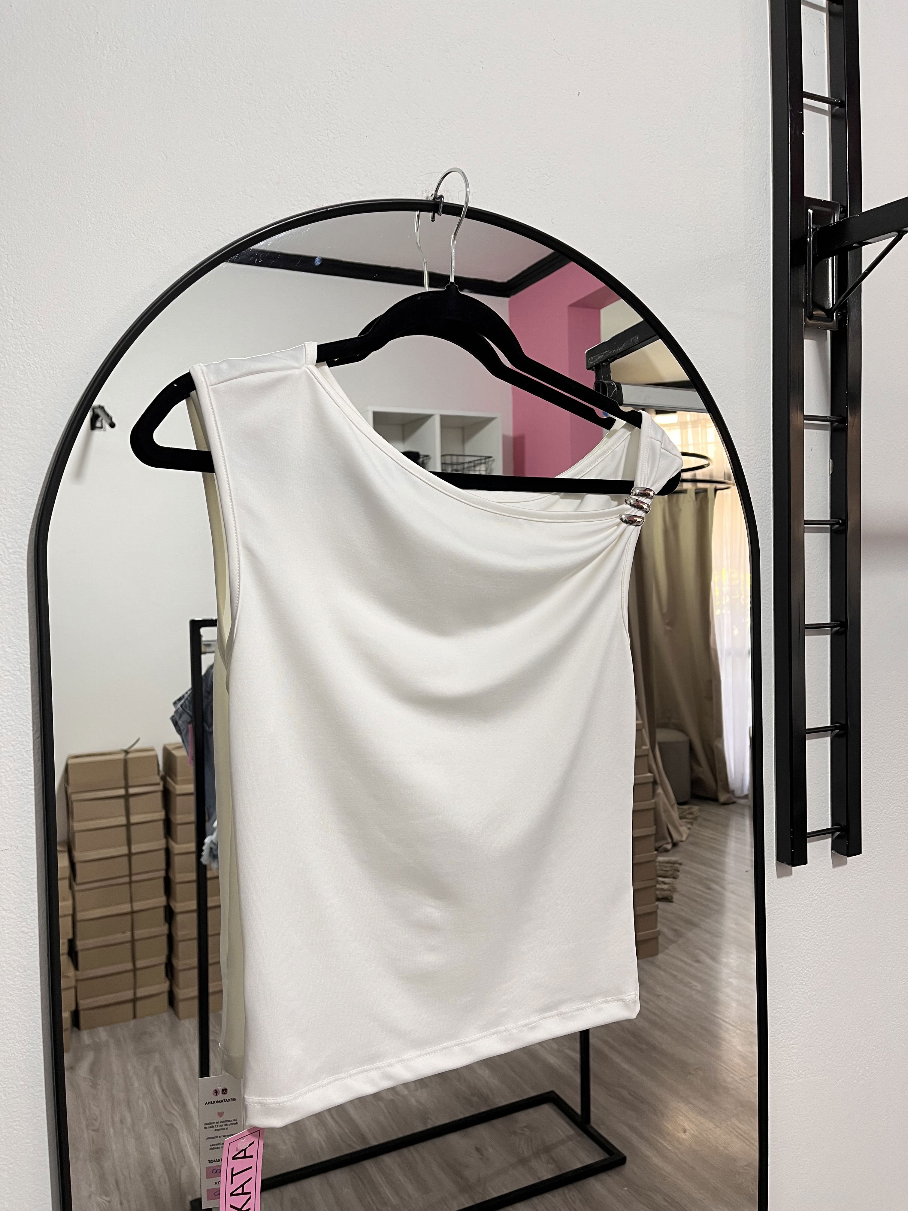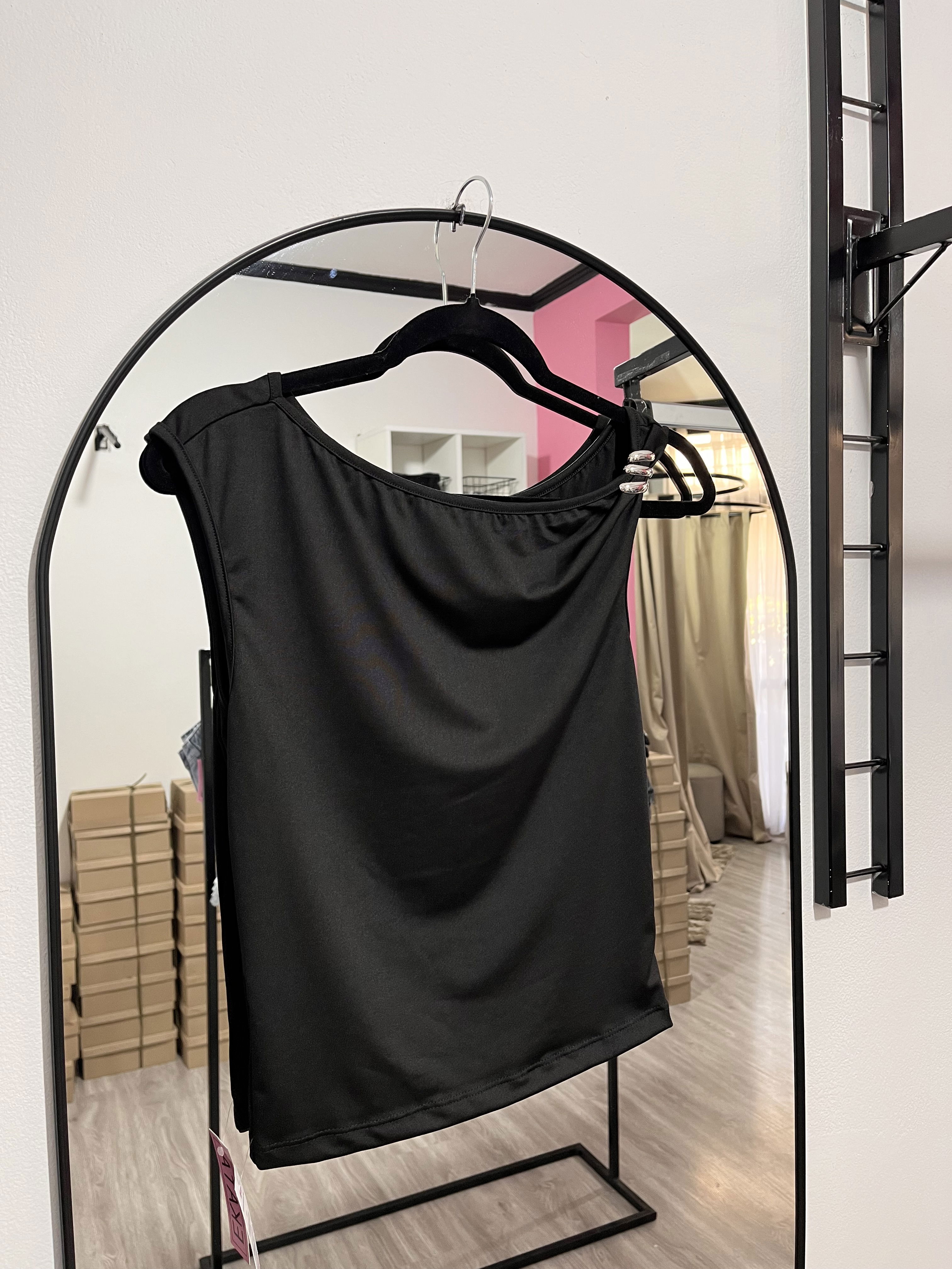Top de lycra, con detalle metálico en la parte delantera.